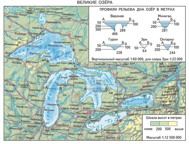 На юго-востоке Канады, на границе с США, расположены Великие озера Северной Америки: Верхнее, Мичиган, Гурон, Эри и Онтарио. Четыре из них (кроме озера Мичиган) разделены между Канадой (провинцией Онтарио) и Соединенными Штатами Америки. Все Великие озера соединены между собой, а из озера Онтарио вытекает река Святого Лаврентия, впадающая в одноименный залив Атлантического океана.