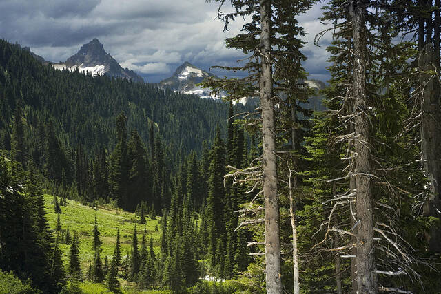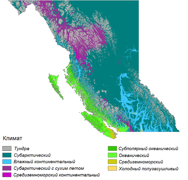 Влажный климат благоприятствует хвойной лесной растительности, растут ели (чёрная и белая), кипарисовики, туи. Дальше к югу сосны, белая пихта, красный кедр, американская лиственница и вечнозеленые секвойи высотой 100 м. Можжевельники и вереск с дубами сменяют степи с преобладанием злаковых и полыней.