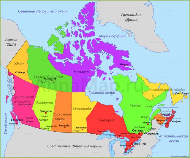 Территория Канады делится на 10 провинций (Альберта, Британская Колумбия, Манитоба, Нью-Брансуик (единственная официальная двуязычная провинция), Ньюфаундленд и Лабрадор, Новая Шотландия, Онтарио, Остров Принца Эдуарда, Квебек (здесь преобладает французский язык), Саскачеван) и 3 территории (Северо-Западные территории, Нунавут, Юкон (так же двуязычна)):